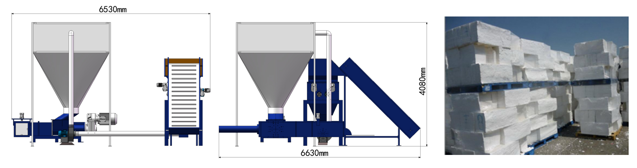 秦風機械正在制造泡沫塑料壓實機來解決這個問題,它可以減小 EPS 材料的尺寸。最終產品是 EPS 塊材,密度可達 400 千克/立方米??蛻艨梢暂p松地將 EPS 材料運送到其他回收處理單元。